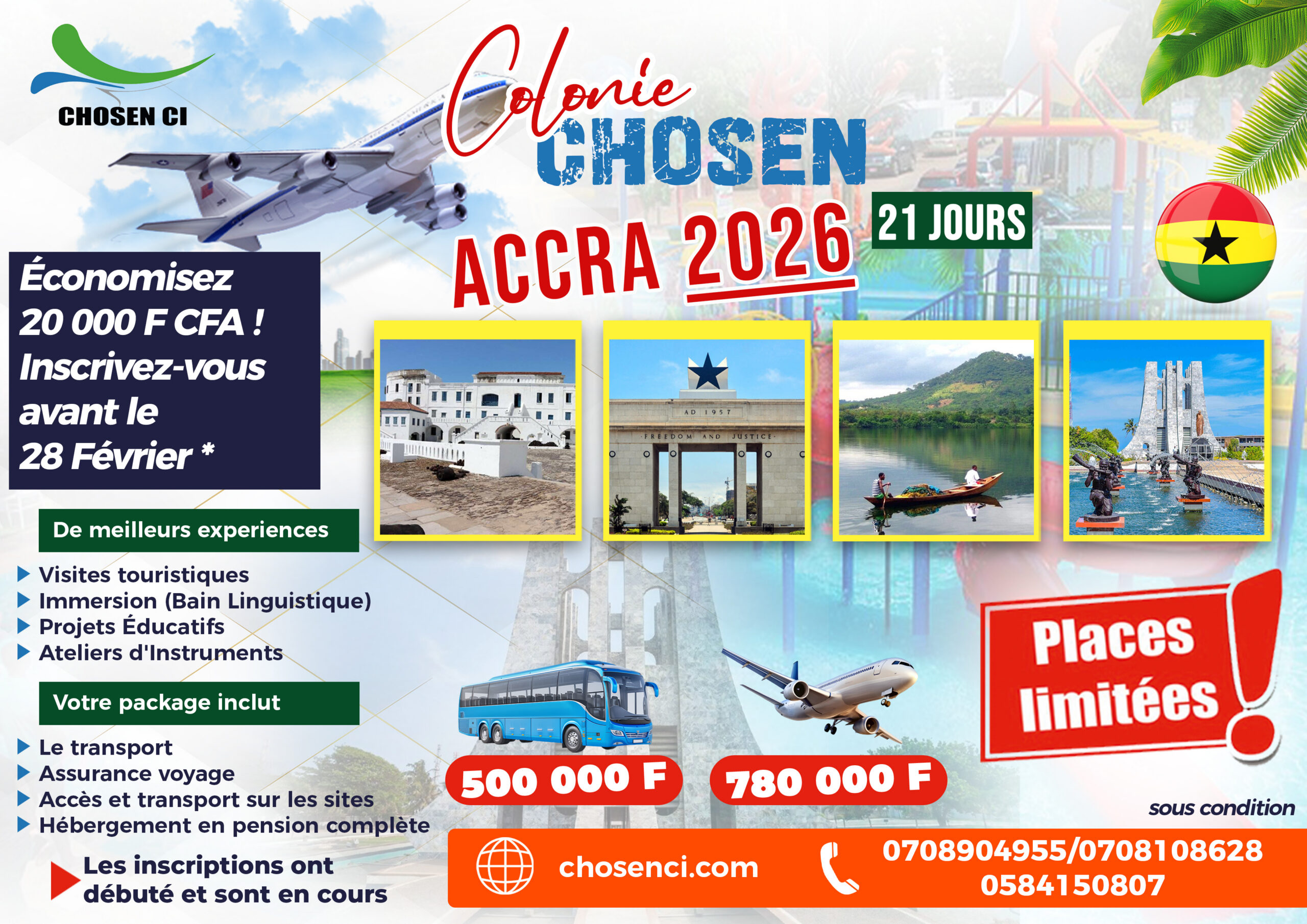 Accroche : L’aventure 2026 commence ! CHOSEN CI est ravi de lancer les inscriptions pour la Colonie Biblique d’Accra, Ghana. Sous le thème inspirant « La Véritable Lumière » Jean 1:9, nous proposons un séjour de 21 jours du 1er au 21 Juillet 2026 axé sur l’éveil spirituel et le développement personnel.